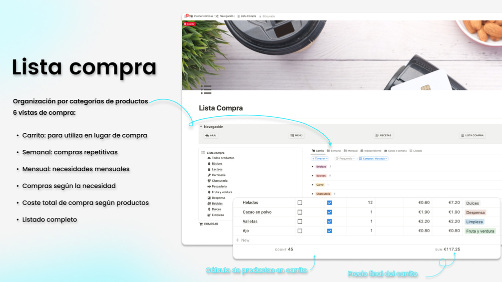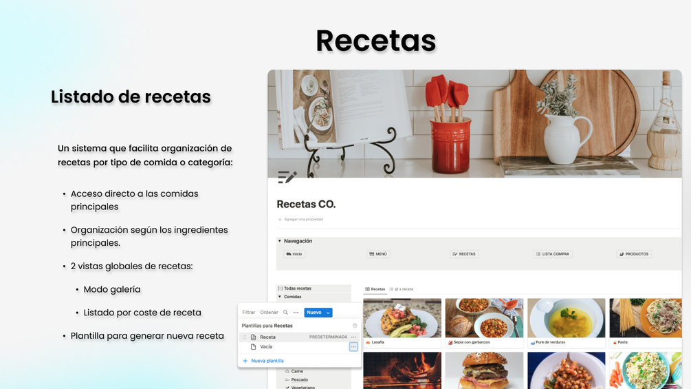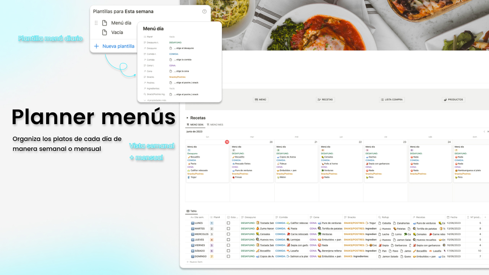 La organización del menú y la planificación de las comidas diarias con una plantilla de Notion ofrece varios beneficios. En primer lugar, puede ayudarte a maximizar tu tiempo y esfuerzos en la preparación de tus comidas, lo que puede ahorrarte dinero a largo plazo. También puedes asegurarte de que estás comiendo una dieta equilibrada y saludable. Además, al tener una lista de compra en la misma plantilla, puedes ser más eficiente en tus compras y evitar olvidar algún ingrediente. Por otro lado, la plantilla también tiene una sección de recetas que se pueden organizar según el tipo de comida, como desayunos, almuerzos o cenas, lo que la hace aún más útil para la planificación de las comidas diarias. En general, una plantilla de Notion para la organización de comidas y lista de compras puede ayudarte a ser más productivo y saludable.