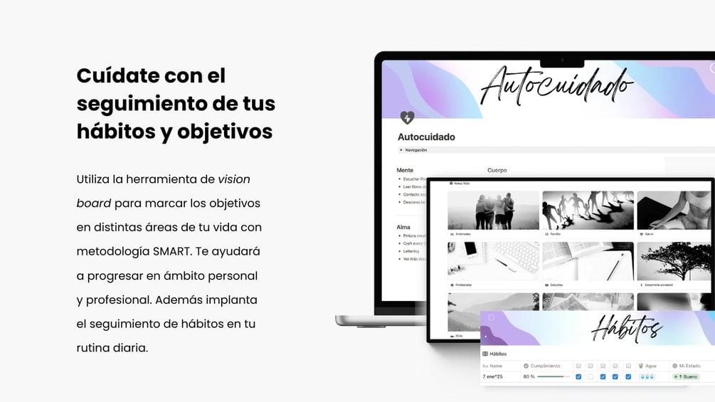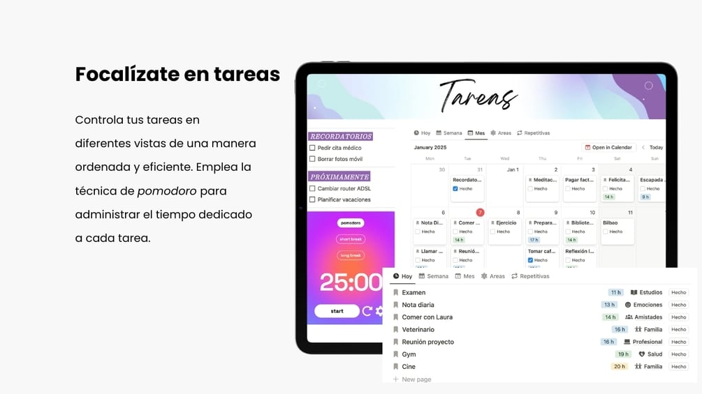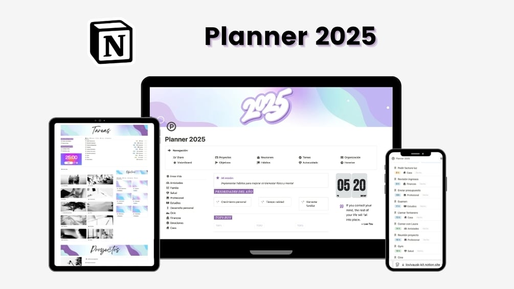Planner 2025 es un sistema revolucionario desarrollado en Notion que transforma tu organización personal y profesional. Esta solución integral te ofrece: